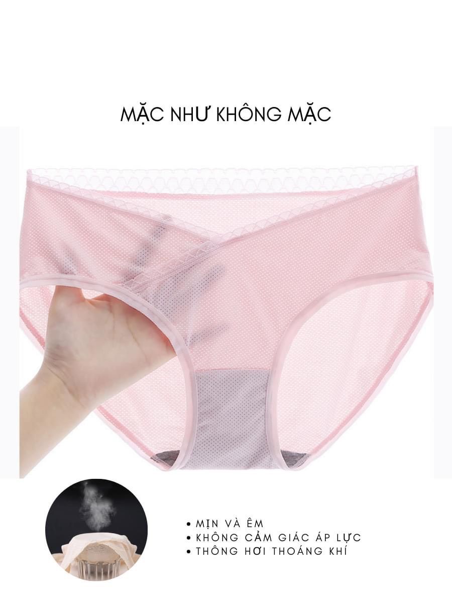 - Quần lót bầu thiết kế cạp trước vắt chéo cách điệu phía trước, không gây lằn, mang đến sự nhẹ nhàng, cảm giác thoáng mát, dễ thở cho bụng mẹ, đặc biệt phù hợp với bụng bầu to.